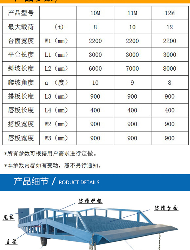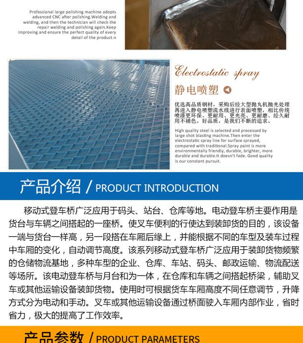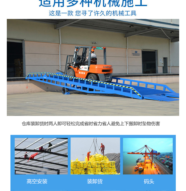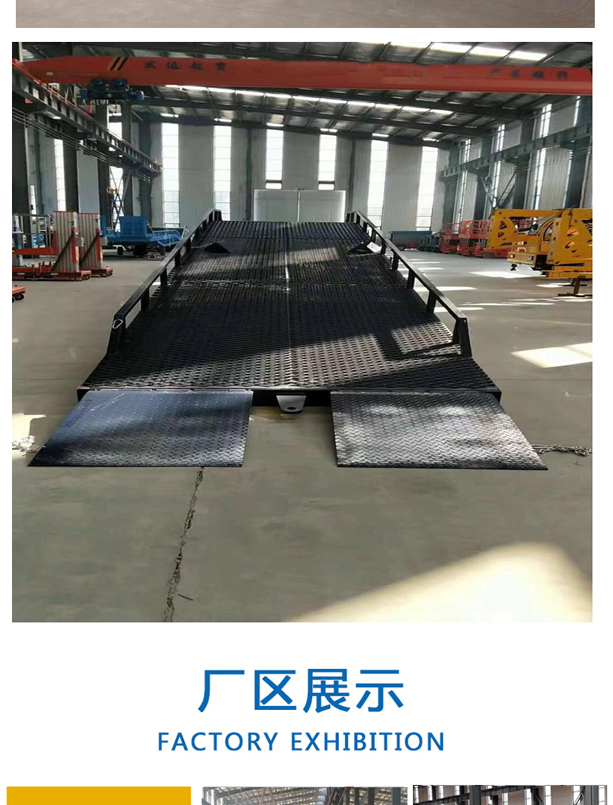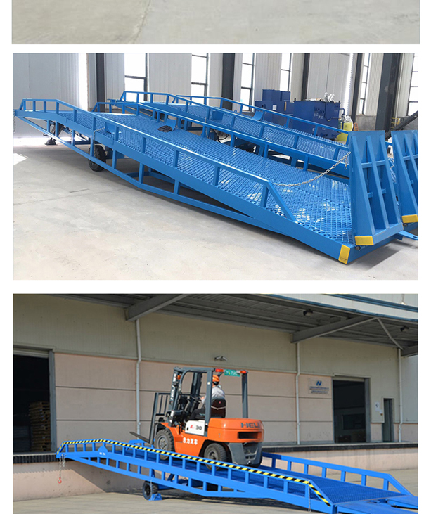 固定式登車橋廣泛應用于碼頭、站臺、倉庫等地。電動登車橋主要作用是貨臺與車輛之間搭起的一座橋。使叉車便利的行使達到裝卸貨的目的,該設(shè)備一端與貨臺一樣高,另一段搭在車廂后緣上,并能根據(jù)不同的車型及裝車過程中車廂的變化,自動調(diào)節(jié)高度。
